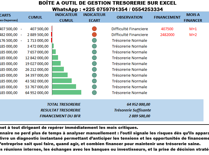 Notre boîte à outils de gestion de trésorerie offre une solution complète, intuitive et immédiatement opérationnelle pour anticiper, piloter et sécuriser la trésorerie d’une entreprise. À partir du tableau présenté, plusieurs atouts majeurs se dégagent :